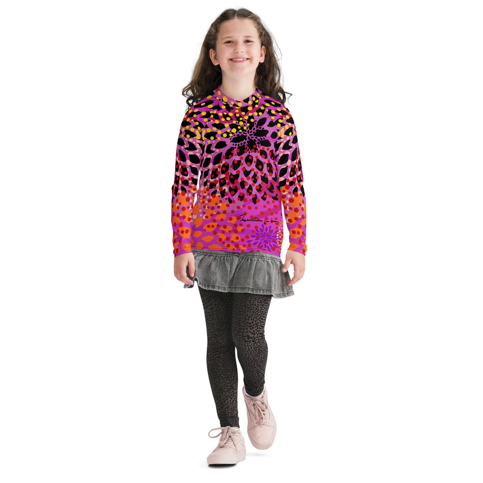 "Be Bold" and colorful with this design by the artist Zsavita. This soft rash guard is the right fit for any active youth or teen who loves water and contact sports. Its longer body and sleeves will protect the skin, while the fitted design means it won't get in the way even during the most intense activities.